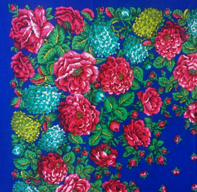 Синий цвет, просто обалденный, яркий, насыщенный, очень красивый. Розы и георгины родаминово-красные. А какие гортензии.... Второй день, буквально не отрывая смотрю на шаль.