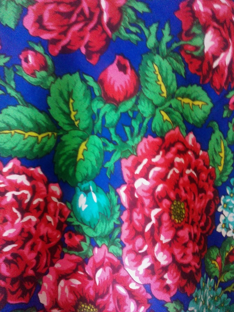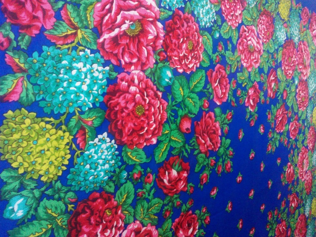 Синий цвет, просто обалденный, яркий, насыщенный, очень красивый. Розы и георгины родаминово-красные. А какие гортензии.... Второй день, буквально не отрывая смотрю на шаль.