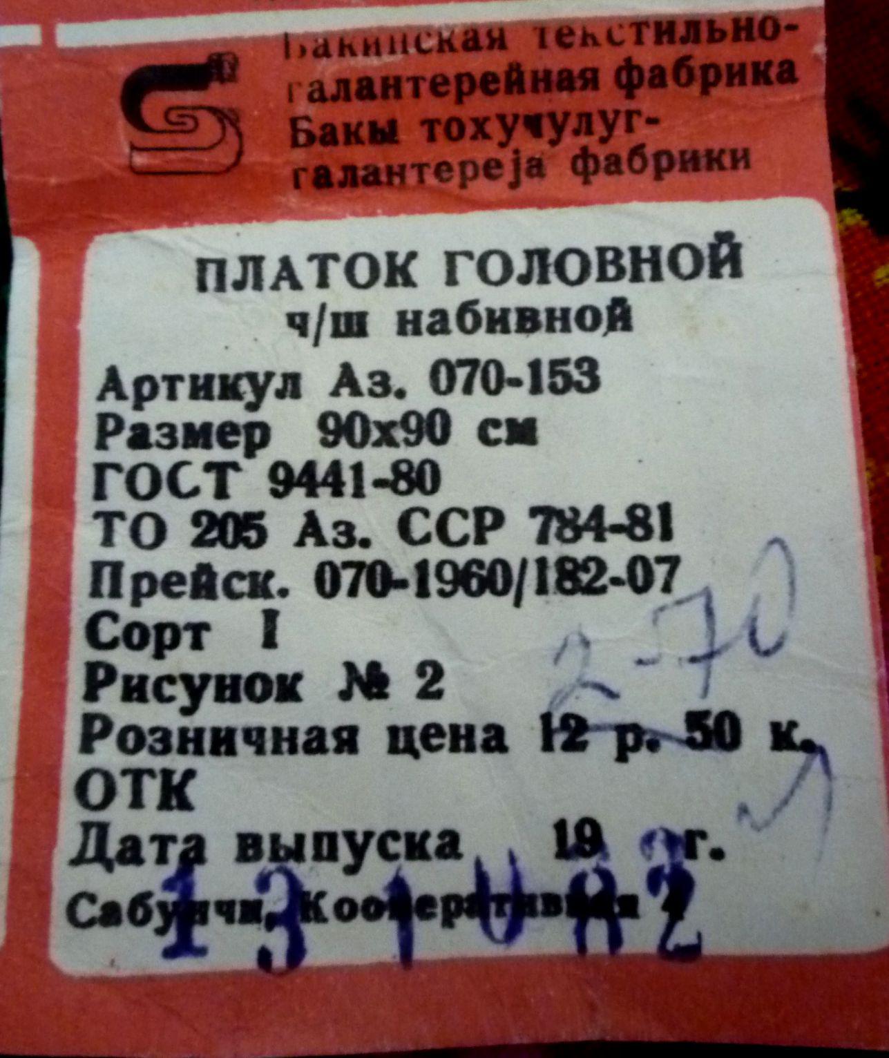 На просторах интернета нашелся платок, 90х90 см. Он произведен в Баку, сохранилась этикетка.