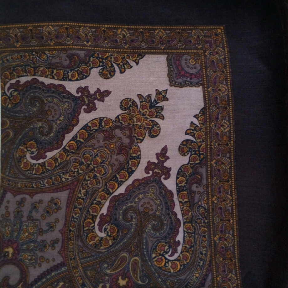 Попадаются винтажные (?) рисунки с композицией, которая отсутствует на платках производства самой ППМ. Орнамент составлен из четырёх пышных угловых автономных букетов, каждый из которых расположен на каждой четверти платка