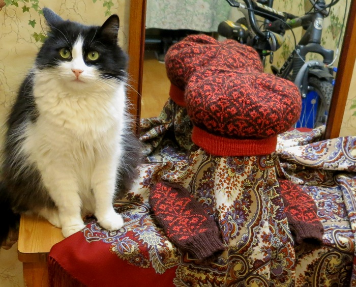 В этот раз начала вязать с 8- го ряда, набрала 216 петель, спицы 2,5 и 2 (ободок). Пряжа- коричневая- "Секрет успеха", рыжеватая- "Кроха" (троицкая). Платочка совсем в тон не нашлось, поэтому снимаю с Чародейкой 16. Ёжика сюда никто не звал, он сам запрыгнул...