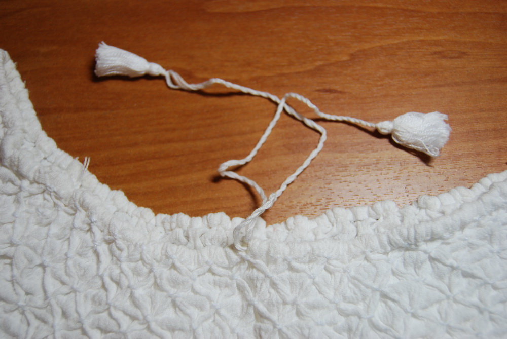 Люба, на мой ,непрофессиональный взгляд, шнурок скручен вручную из сложенных в несколько прядей нитей. А кисточка на конце самая обычная, из простых белых ниток. Не крученых. В рукаве продернут такой же шнурок. Выход из кулиски (это отверстие в которое входит и выходит шнурок с кисточкой?) на плече, как на фото.