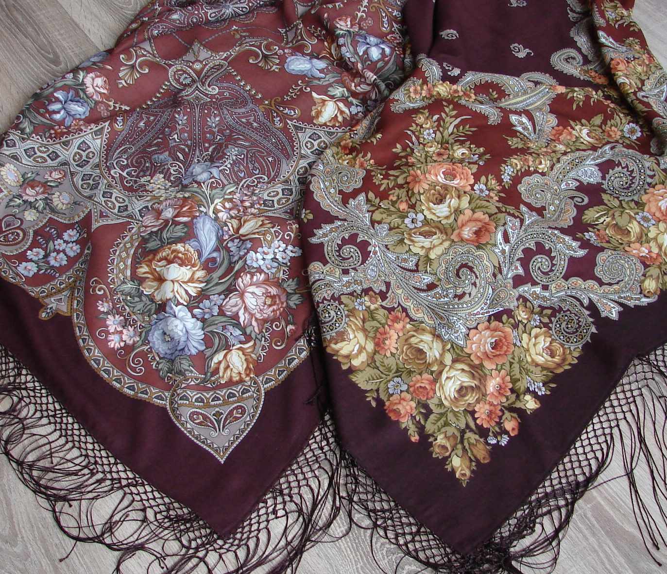Почему-то на фото этот платок новой печати выглядит холоднее по оттенкам, чем в реальной жизни