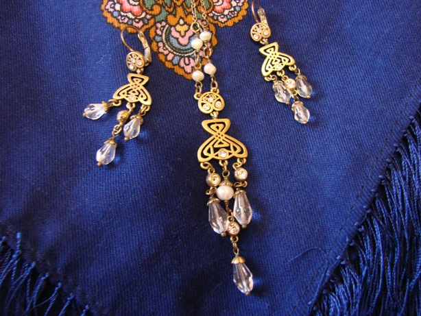 Вот, например, бижутерия моя любимая норвежская, кое-что из жемчуга, бирюза в серебре. А вот этот комплект (комплектом никогда не ношу, что-то одно надеваю, т.к. броский для меня) по-моему немножко в русском стиле такой, серьги особенно. Могу ошибаться, но у меня такое впечатление))