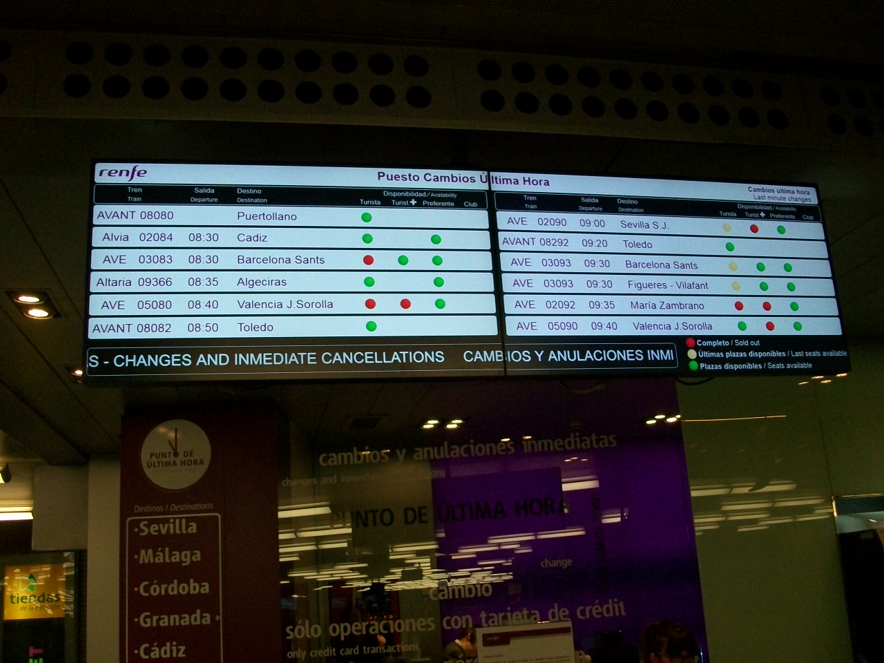 Путешествовать скоростным поездом мне очень понравилось. Он комфортный и дорога от Мадрида до Кордобы всего 1час 40 минут. Билеты можно купить в Мадриде на вокзале Аточа. Причем у билетной кассы есть табло показывающее не только наличие билетов, но и их класс. Сам вокзал не совсем понятен - там четыре выхода на разные направления и надо спрашивать куда идти. И Кордоба не конечная станция. Только по времени выезда и по номеру поезда я поняла, на какой поезд мне нужно. Конечная станция у этого поезда была Кадис.