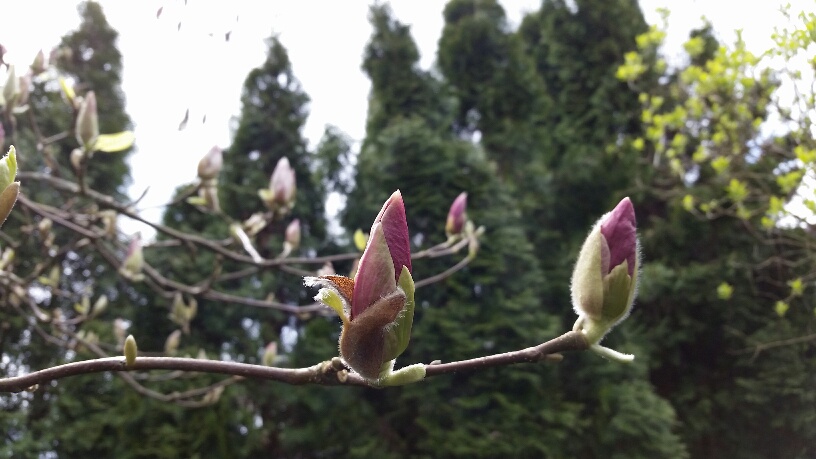 уже виднеются розовые лепестки на магнолии (фото против солнца, ничего не видно)...