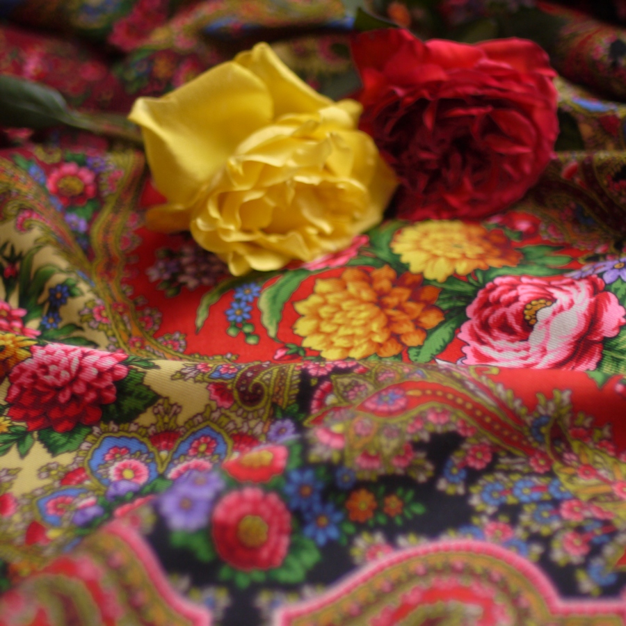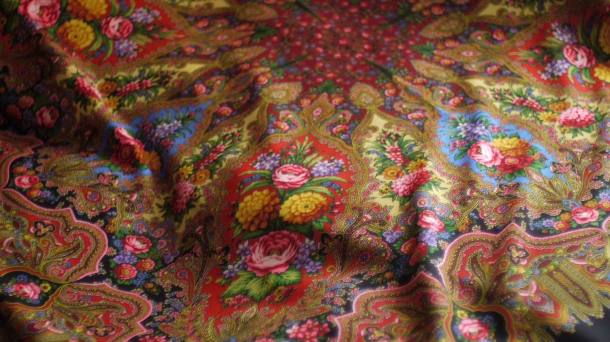 Всё понятно с желтыми цветками - это цветки темно-желтых и оранжевых бархатцев. Любимый индийцами цветок. Одна из восточных ассоциаций. В общем - не шаль, а ящик Пандоры, набитый ассоциациями. Какая ещё выскочит?