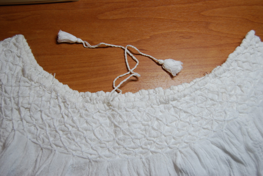 Люба, на мой ,непрофессиональный взгляд, шнурок скручен вручную из сложенных в несколько прядей нитей. А кисточка на конце самая обычная, из простых белых ниток. Не крученых. В рукаве продернут такой же шнурок. Выход из кулиски (это отверстие в которое входит и выходит шнурок с кисточкой?) на плече, как на фото.