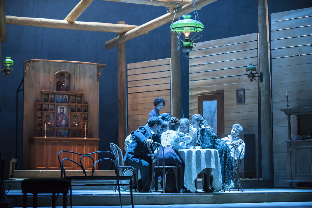 Алла, вообще, да, если костюмы исторические, то и платки должны быть старинными, из сундука. Но, что касается спектакля Васса Железнова в Малом, то это не совсем так. Я смотрела этот спектакль и видела то, что не видно на этих фото - декорация там довольно условная. На фото мы видим как-бы реальный интерьер комнаты, но если бы камера отъехала, то мы бы увидели, что эта комната - это всего лишь стены, которые висят в пространстве. То есть, дом Вассы - это не реальный, живой интерьер, а некий образ - дом, в котором нет жизни. Деревянные балки, через которые сочится свет, потолок, который то нависает, то растворяется в пространстве. Художник-постановщик - гений нашей современности Эдуард Кочергин. Вот фото из спектакля, которое даёт более общий план.