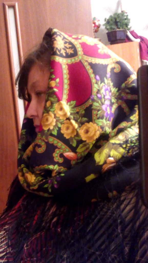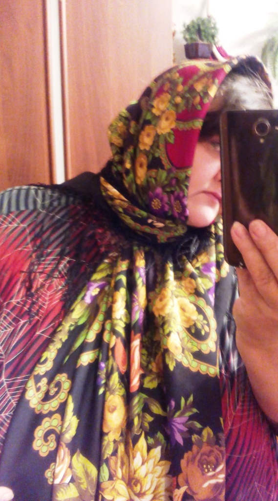 Ну и сделала несколько "себяшек", что бы было видно, как лежит рисунок, когда шаль на голове. За качество прощу прощения, уже темно.
