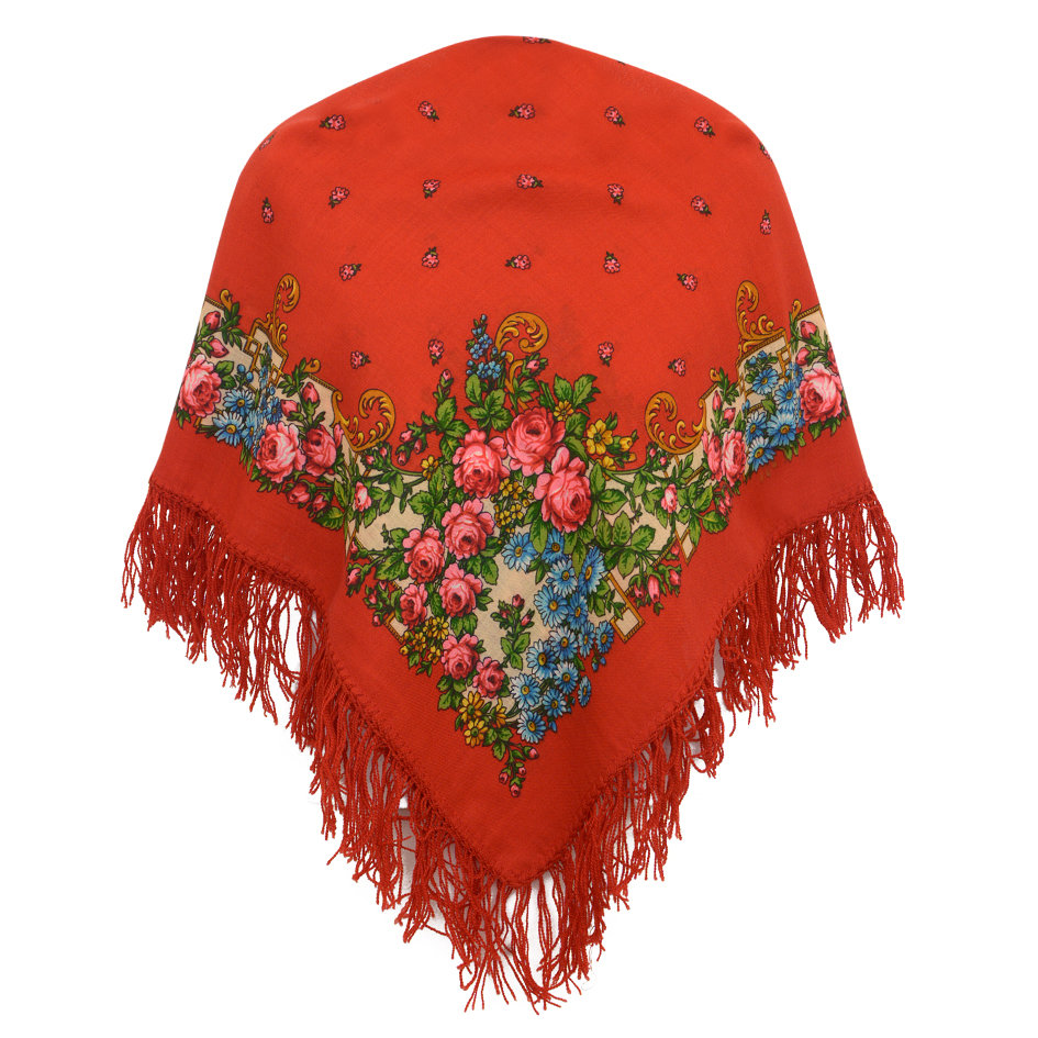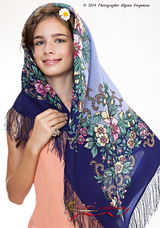 Невероятно нежная модель, выполненная по мотивам традиционных узоров. На белом фоне красиво разбросаны букеты из синих и красных роз в сочетании с веточками зелени. Растительный орнамент стремится к центру платка, превращаясь в изящные узоры. Динамичность картины навевает мысли о пробуждении природы. По периметру павлопосадский платок украшен шёлковой бахромой. Автор рисунка, Ирина Дадонова, сумело совместить классические элементы русских аксессуаров с модными в нынешнем сезоне оттенками.