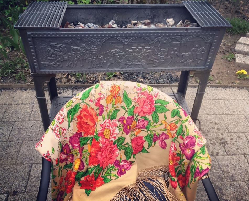 В другие сезоны из дома беру 1 большой платок 146х146 или шаль (т.к. часто мерзну в самолете), а остальное потом заимствую у дочки, когда выбираемся куда-нибудь. Если едем на несколько дней, беру 2-3 платка себе, столько же ей, да еще внука укрывать в машине, колясках, теперь в надувном диванчике (синие Ларец самоцветный и Над серебряной водой – считай, его аксессуары). Поэтому и возникает, наверное, впечатление, что вожу с собой чемодан шалей