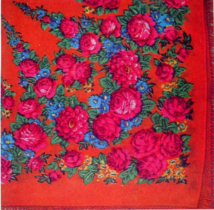 У Надежды Ивановны Слащевой больше цветочных композиций, реже она делает орнаментальные. Розы у нее точеные, в композиции - особая аккуратность. Ее шали переполнены цветами, художница стремиться весь платок заполнить рисунком. "Стараюсь быть верной традициям, - говорит Н.И. Слащева, - и в то же время привношу в платок что-то свое: композицию, порой измененную стилизацию, разработку деталей. Жизнь толкает на это. Ручная набойка сокращается, увеличивается машинная. Раньше, при ручной набойке, более точно и тщательно выписывали каждую деталь, сейчас машина предъявляет иные требования ..."