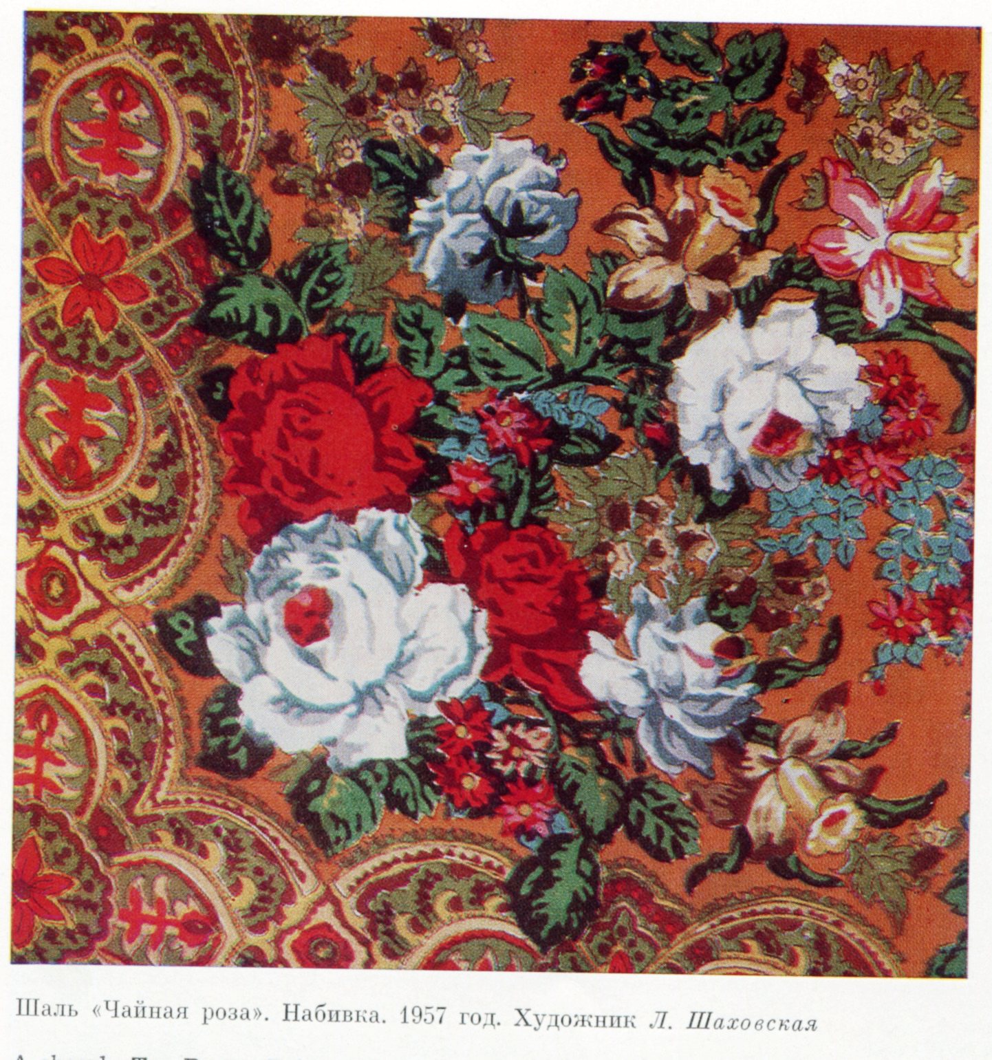 Белые розы у нас в архиве хорошо представлены. Помните там по краю такая необычная роспись из медальончиков? А посмотрите, какой вот здесь удивительный рисунок!!! (фото из той же книги) Видимо, это бабочки:)) Шаль называлась Цветочный мотив 1950-е гг.