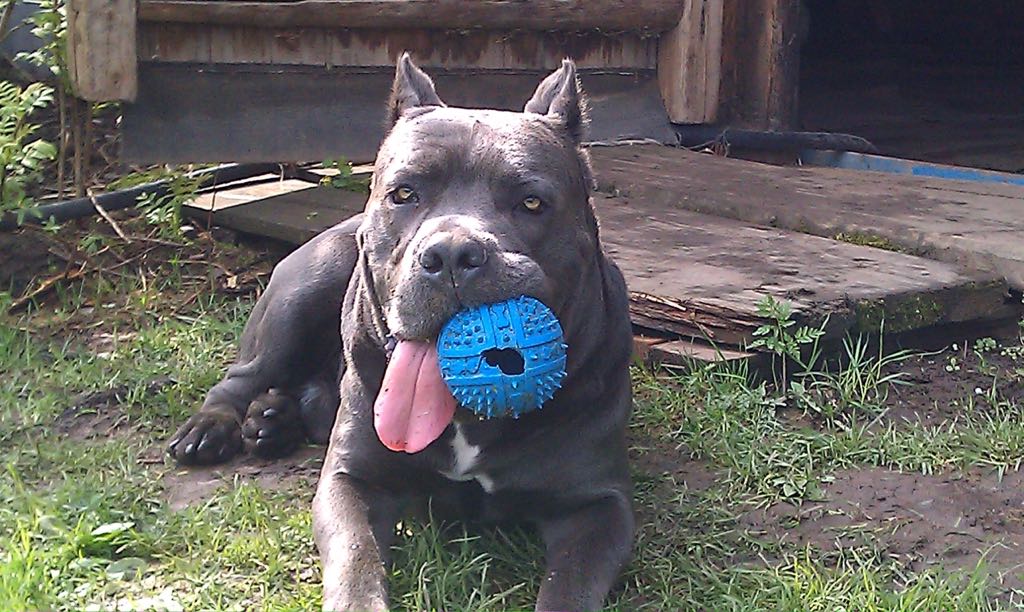 У корсо очень мощная шея и челюсти, Борз с таким бревном ещё и бегал.