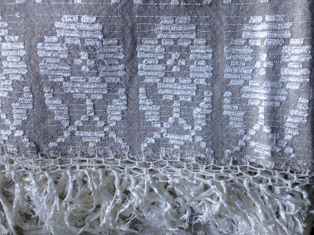 Есть у меня очень старая домотканная скатерть. Дореволюционная. Ее ткала моя пра- прабабушка сама на огромном станке, который сохранился в деревне, фото станка пока нет. Цвет скатерти ярко оранжевый, рисунок двухсторонний, бахрома собственная. Немного требует реставрации- привести в порядок бахрому. За почти 100 лет нитки крепкие, плотные, хотя моя мама использовала скатерть иногда по назначению- а зря:(, лучше бы сохранилась.
