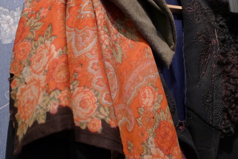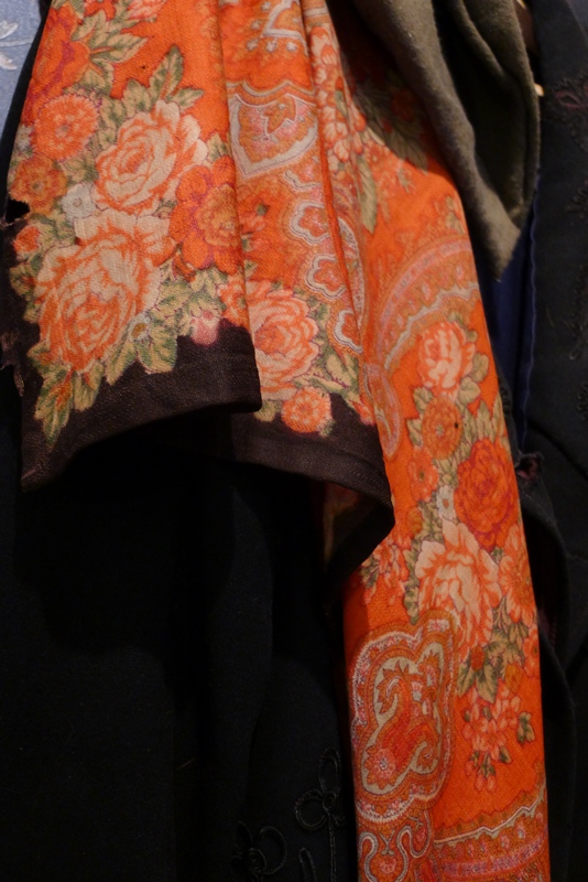 Будучи в Угличе, оказались в музее городского быта XIX- начала XX в. Музейчик маленький, в нарядном кружевном домике 1897 г. когда-то была городская публичная библиотека. Теперь в нескольких комнатах собрана всякая всячина из быта провинциальных обывателей. На одном из манекенов траченное молью черное пальто, а на плече такая же видавшая виды шерстяная шаль. Какая-либо информация о платке отсутствует. На беглый взгляд, похоже на ППМ.