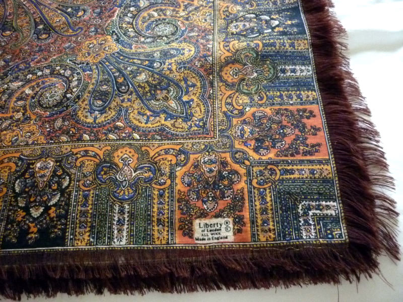 Вот еще одна современная шерстяная шаль (для демонстрации размера -- на столе) и шелковый платок того же производства. Англия -- рулит