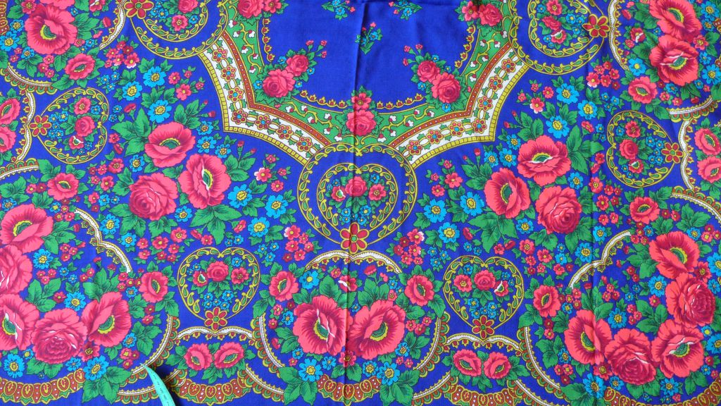 Хочу показать и я свое последнее приобретение. Я платки в последнее время практически не покупаю, но в эту шаль влюбилась с первого взгляда, бегала на нее смотреть и в конце концов купила, не удержалась. Шаль туркменская, есть даже надпись - обожаю вязь, загадочные буквы, теперь у меня и шаль и кольцо есть с восточными надписями вязью. Но художник, мне кажется, павлопосадский и у меня даже есть подозрение на одного, но пока не буду высказывать, подожду, может быть, понимающий народ выскажется. Характер шали - сдержанный, элегантный, немного торжественный и я, бы сказала, концертный. Уже вторая у меня туркменская сдержанная красотка. Набойка ручная, на мой глаз. Прошу любить и жаловать.