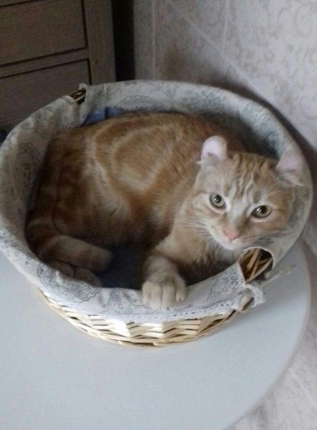Но он так привык к своей корзинке, что так и спит в основном в ней.