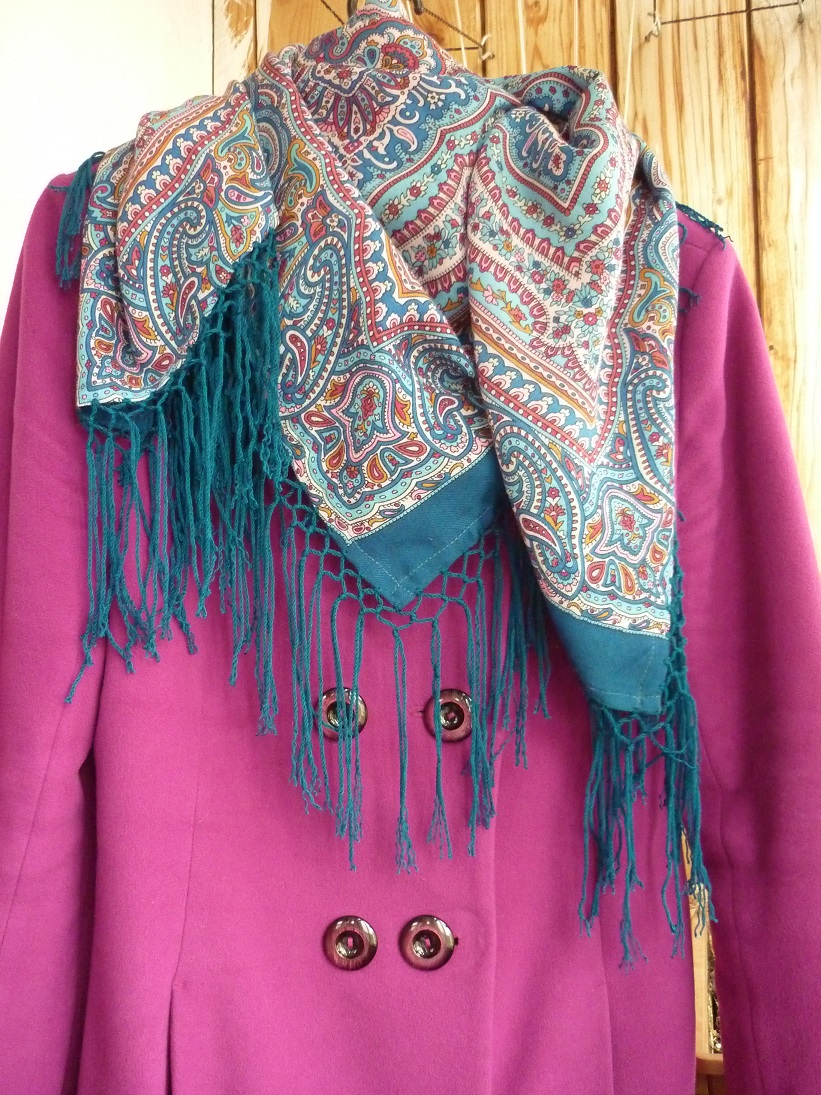 живенько так (бахрома не в тон для меня вполне может быть приятной глазу, поэтому мне оно глаз "не царапает" - а наличие бахромы как факта для платка/шали этого формата тоже хорошо)