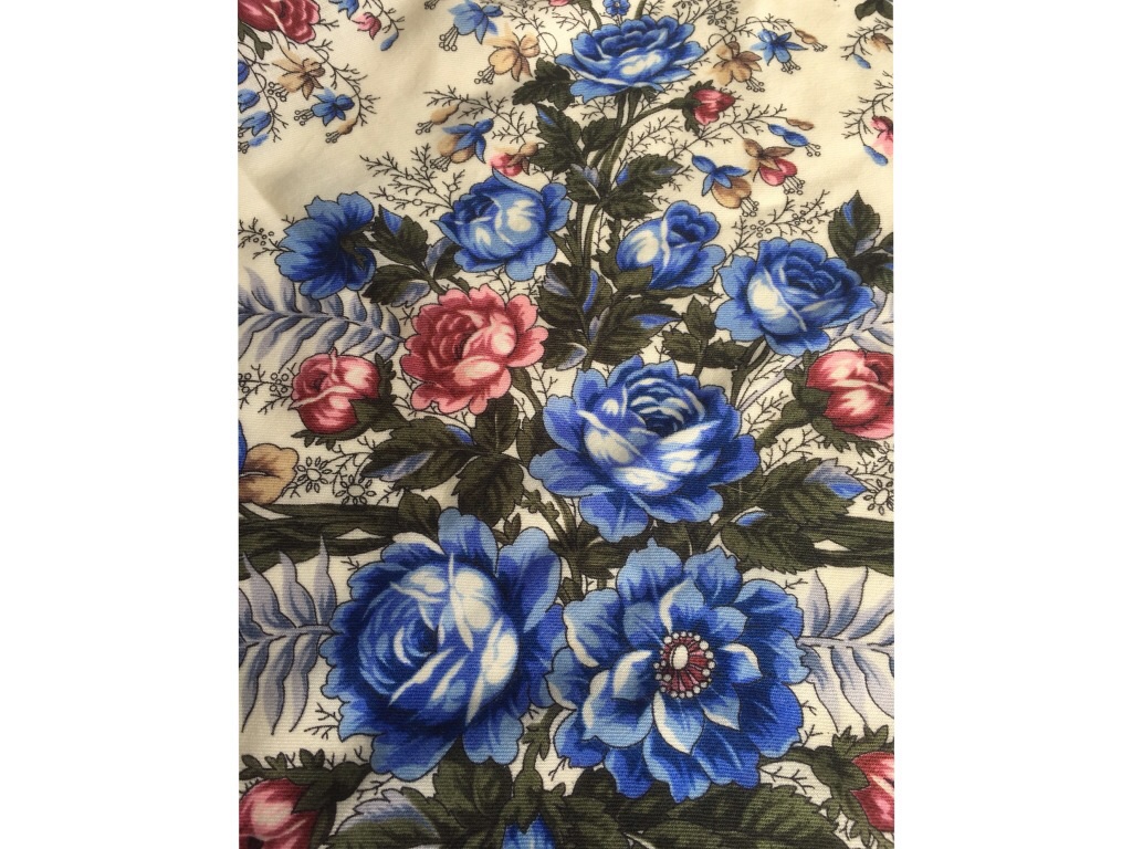 Не знаю видно ли это на мониторе но Малиновка явно желтее. Гжель (что на фото) была платком 1 сорта. Бахрома была снята, кайма заужена.