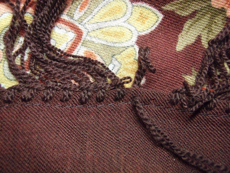 Здравствуйте! Хочу поделиться способом, как переделать бахрому на платках с ШЕРСТЯНОЙ бахромой, чтобы она смотрелась не так грубо (т.е. чтобы не придавал дополнительно объёма платку этот "петельный рубец", который идёт по краю изделия), как в "исходном варианте". Это способ для тех, кто хочет слегка "облегчить изделие", но при этом оставить ТУ ЖЕ САМУЮ БАХРОМУ,и при ПЕРЕДЕЛЫВАНИИ - НЕ ВЫНИМАТЬ ЕЁ ИЗ "РОДНЫХ" дырочек. Краткое описание на фотографиях - но вообще всё очень понятно и просто без слов. Один нюанс - одну "бахромку" всё-таки придётся вынуть из родной дырочки (отложить, но не потерять!!!) Итак : вынимаем одну "бахромку" из дырки. Слева - полуспущенные петельки. Теперь - два сложенных "хвостика" ближайших слева - перекидываем вперёд - за ними (с левой стороны платка) видим петлю. Аккуратно!!! освободив петлю из переплетения вытягиваем её от себя на такое расстояние, чтобы можно было легко и без усилий просунуть в освободившееся "петельное гнёздышко" два хвостика. Затянули. Перешли к следующей бахромке - и делаем всё точно так же: Хвостики-освобождаем петельку-аккуратно вытягиваем-заправляем в петельку хвостики - затягиваем. Смотрите последовательность на фото: