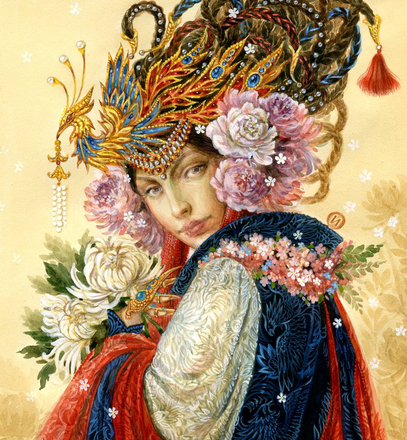 Лучше всего речной жемчуг разглядывать на провинциальных «примитивных» портретах, изображающих купчих и богатых крестьянок XIX века. Как правило, они происходят из Архангельской, Олонецкой, Тверской, Новгородской и Псковской губерний — северных земель, где головные уборы роскошно отделывали речным жемчугом. В основном они написаны анонимными мастерами, хотя сохранилось имя художника-крестьянина — Абрама Клюквина. (Из сайта "Жемчуг в России: история, применение, костюмы...)