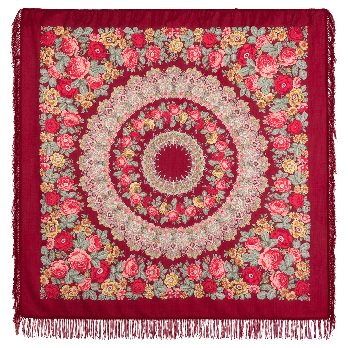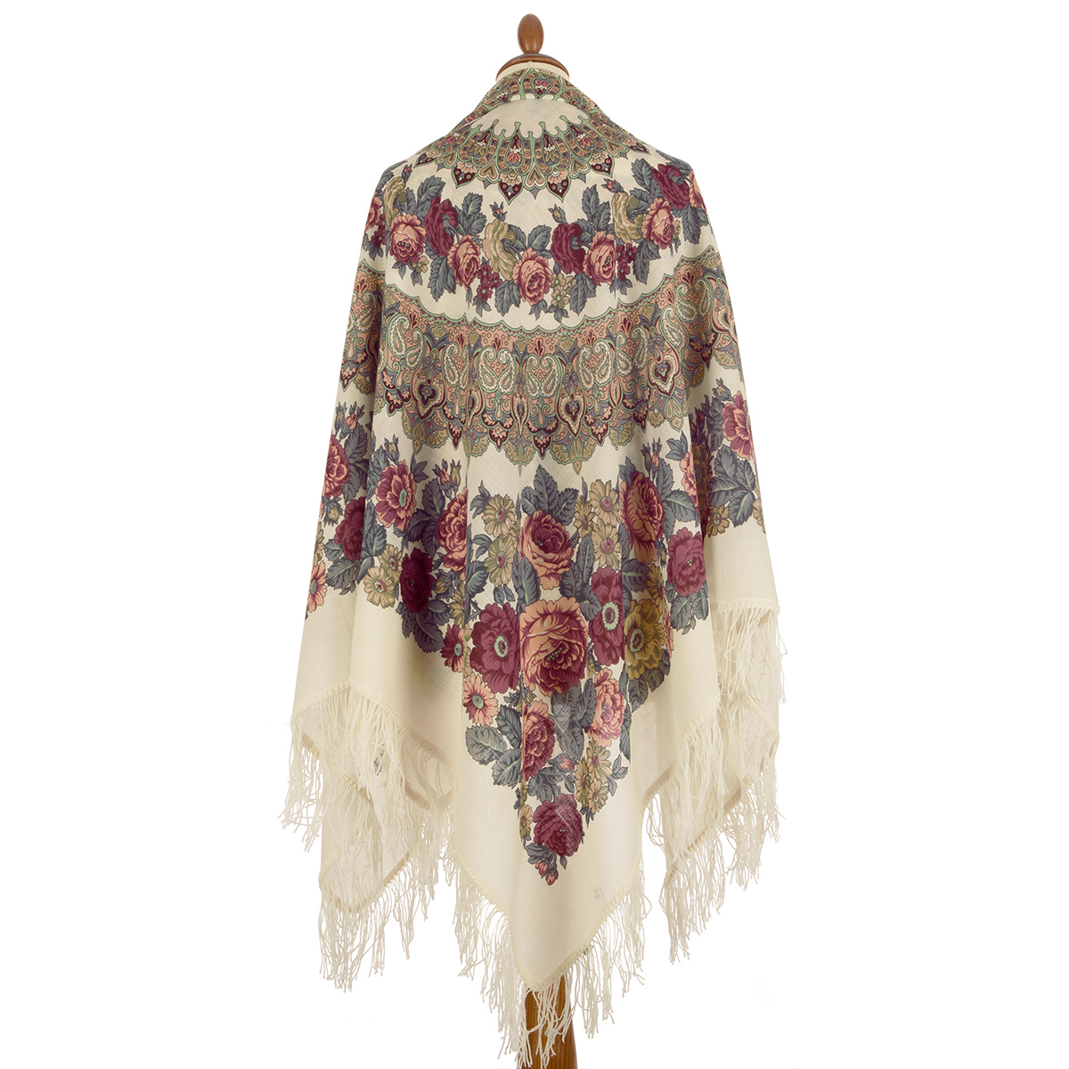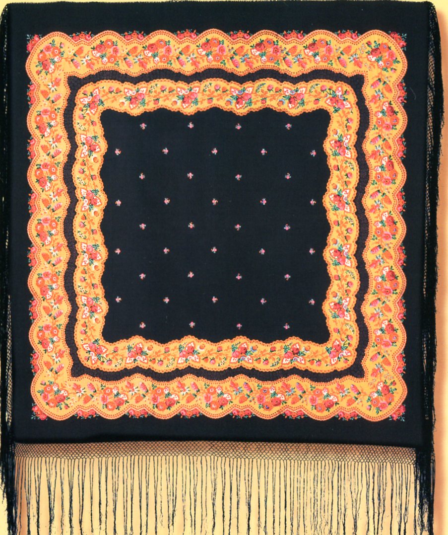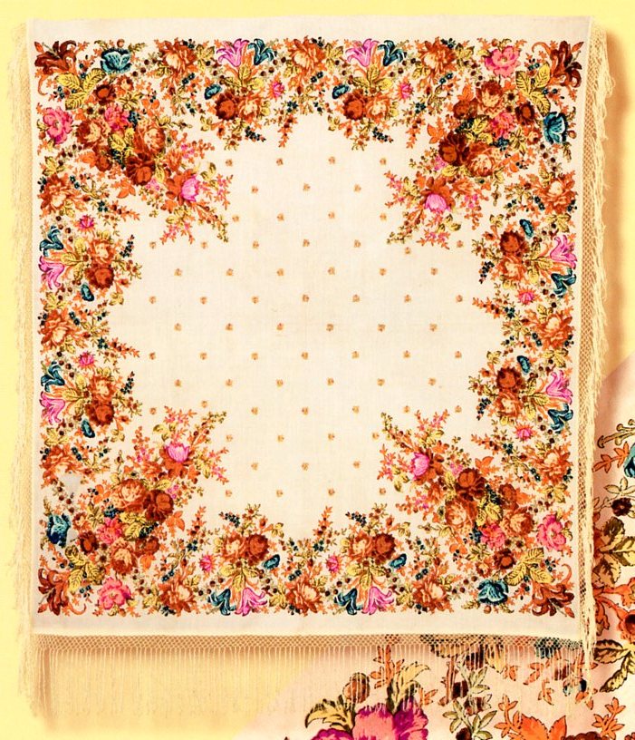 Шаль с традиционным цветочным мотивом "розы". Шёлковая бахрома. Набивка. 1937г.