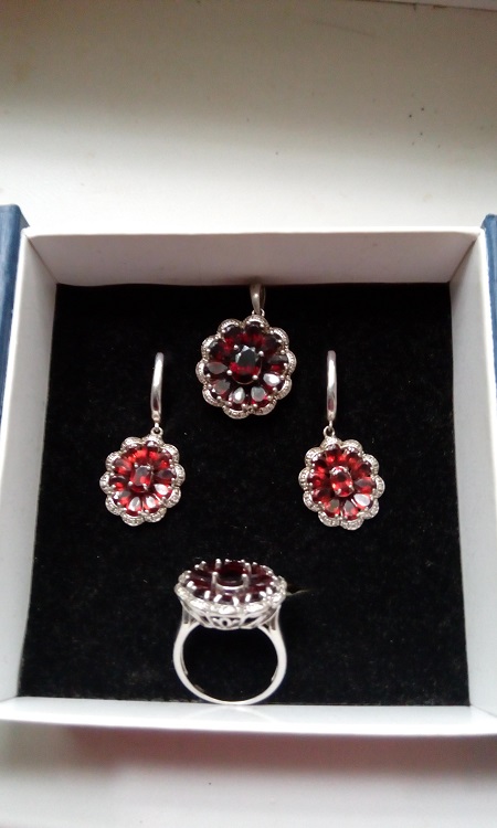 Как много красоты!..К разговору о гранатах,хочу приложить свою фотку..Перстень и кулон покупались на Ювелирной выставке...как чешские гранаты, к которым прилагался сертификат соответствия (он был вскоре выброшен,за ненужностью).В нем была указана чешская фирма-производитель...вставка-гранат,а что еще... уже не помню...
