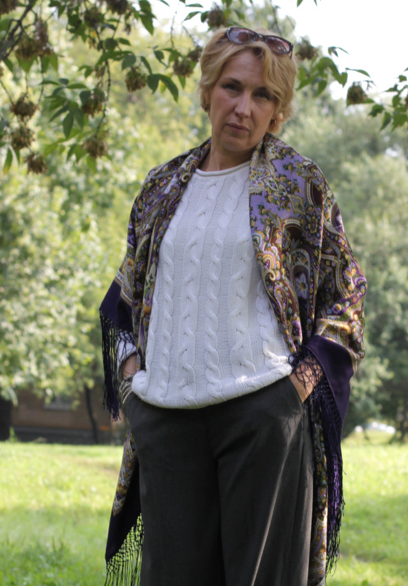 А как желтые цветочки горят в скрутке. :: Фрекен_Жюли, спасибо за прекрасный показ. Образ Нины Александровны создал для меня настроение праздничной шали, а Ваши фото говорят о том, что Единственная хороша и для повседневной носки. И в пир и в мир, как говорится. Единственная она, но может быть разной, сохраняя спокойное благородство и шарм.