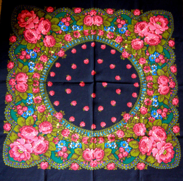 Shkatulka, я думаю, что это не павловопосадский платок. Рисунок стилизован под посадский. Где-то на форуме выложен показ моделей под маркой "Янастасия", там все наряды из такой ткани, напоминайщей ПП платки.