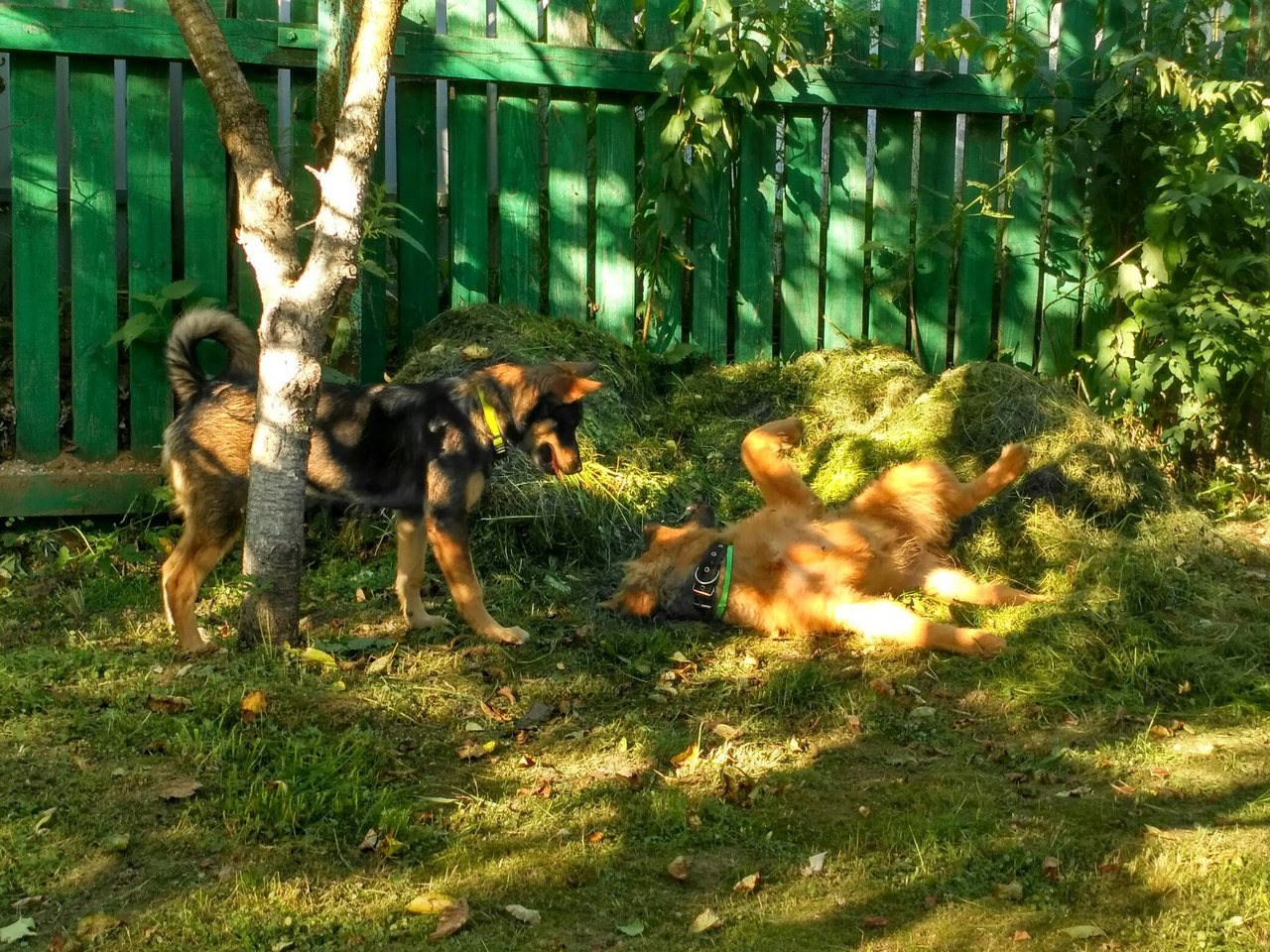 Они очень добрые обе, но рыжая Ракша жуткая хулиганка. Она роет ямы, всё грызёт. Бабулька посадила черенки роз под срезанные пластиковые бутылки, так она таскала эти бутылки и грызла. Терра, которая чёрненькая более дисциплинированная. Когда я выходила и садилась на скамейку они прибегали и совали свои морды, отталкивают друг дружку. С котом играют, он бегает а собаки его как-будто догоняют, котик прыгает на дерево, а они стоят с высунутыми языками и ждут. Когда кот на скамеечке, где его спокойно можно достать, то они его не трогают, ждут пока побежит. На скамейке - это он в "домике", трогать нельзя, а меня всю обслюнявить можно. Но самая главная там мейнкуниха Микси, она их всех построила. Если она сидит на веранде, собаки даже на ступеньки не пойдут, хотя она никого ни разу не поцарапала, ей достаточно зашипеть.