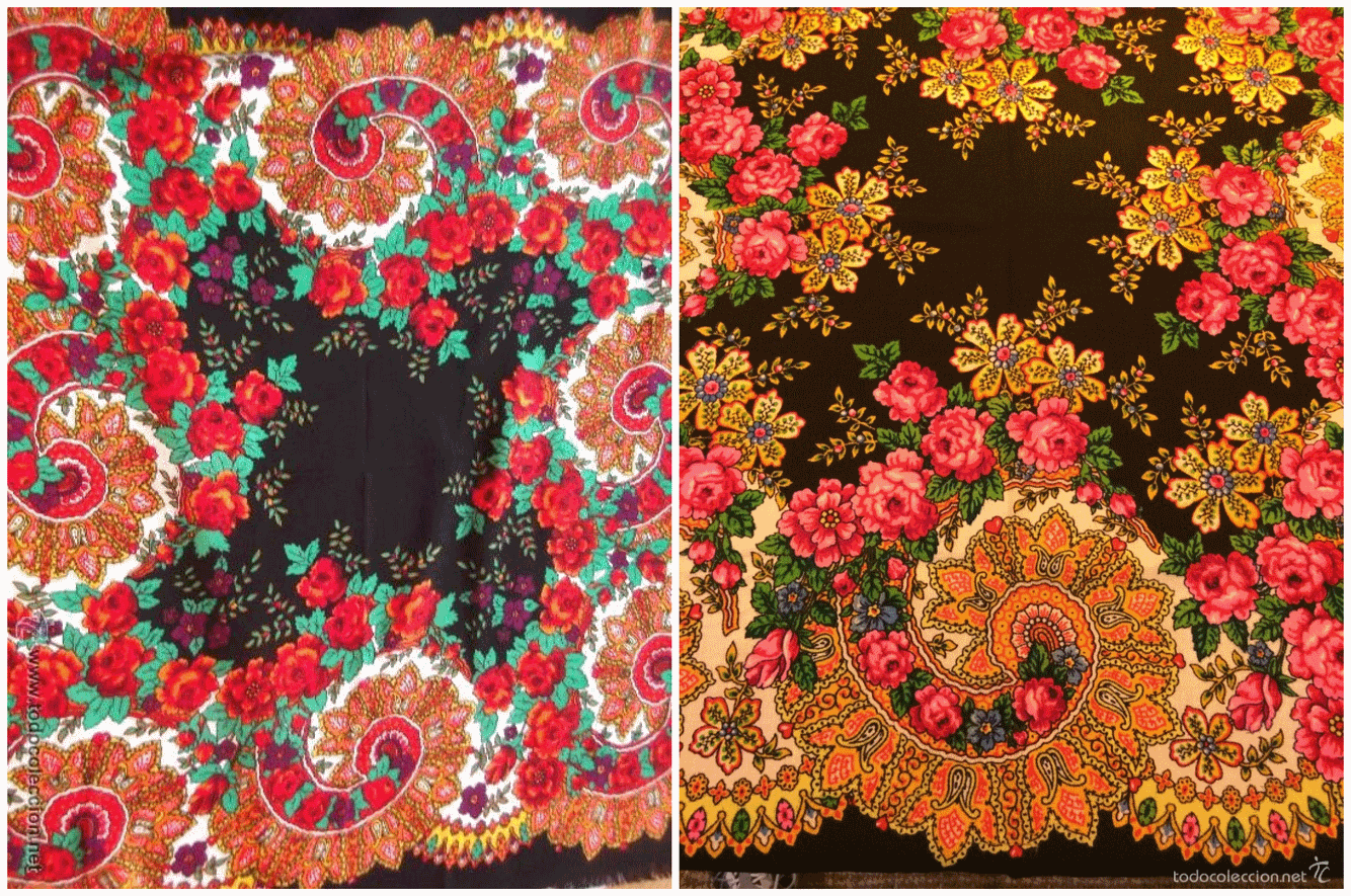 Старинный платок региональный, мериносовая шерсть, происхождение – из Толедо, 95х95 см, по периметру шерстяная бахрома 10 см, плетеная вручную, 150 евро. На черном фоне что-то (?) из цветов.