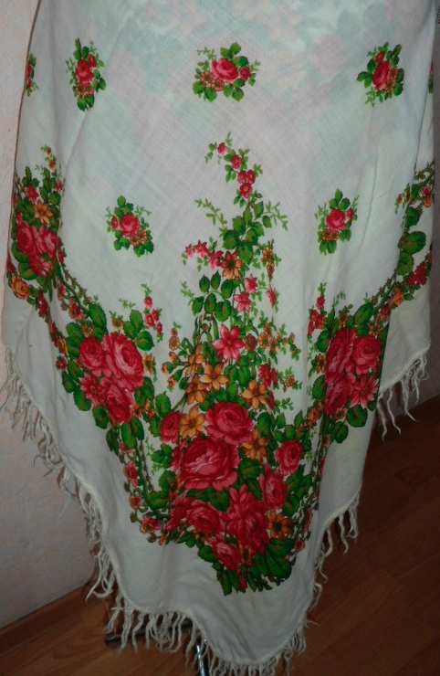 Обнаружился у сестры,ранее принадлежал маме,но я его не помню. Крепдешиновый,размер примерно 89*89...