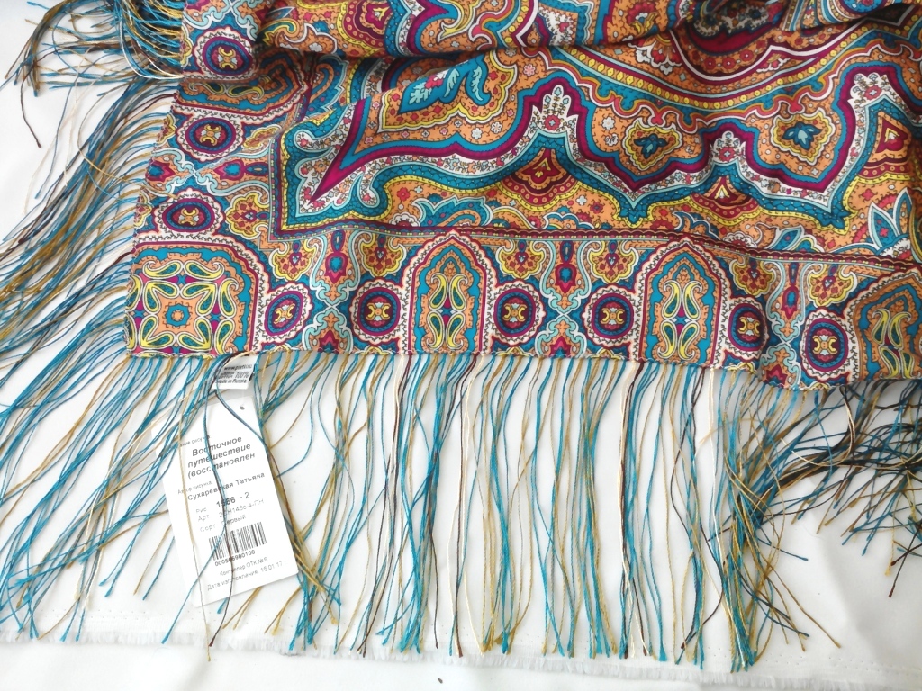 На фото, которые будут третьими, видно, что нитки идеально совпадают по цвету с рисунком. Бахрома смотрится как продолжение рисунка. К сожалению, на фото, где шали полностью, бахрома сильно бликует.