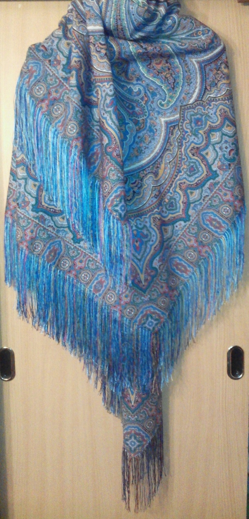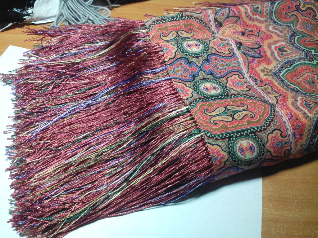 На фото, которые будут третьими, видно, что нитки идеально совпадают по цвету с рисунком. Бахрома смотрится как продолжение рисунка. К сожалению, на фото, где шали полностью, бахрома сильно бликует.
