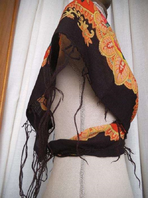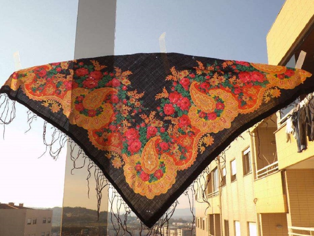 Кроме того, Южный букет1785-5 и шаль с выставки явно имеют разные размеры - шаль значительно больше, кроме того, она с бахромой и, судя по всему, носится традиционным для Португалии и соседней Испании способом - если на плечах - то концы перекрещиваются на груди и завязываются на спине, если на голове - то с обматыванием вокруг головы (как, например, во Вьяна-ду-Каштелу) .