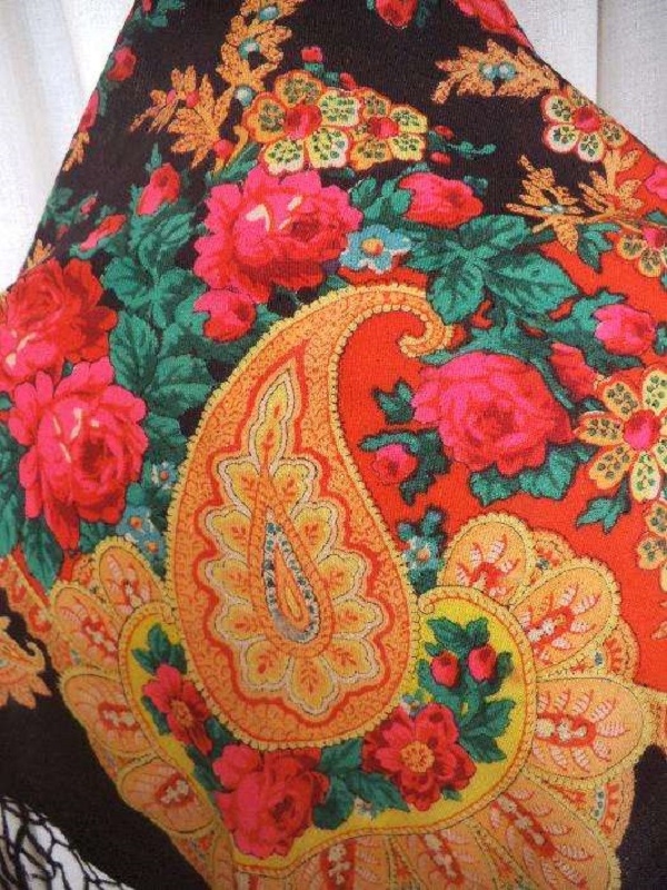 Ниже сравнение тоже со старинной версией Веера (с заостренными листиками), только полностью красной, без желтой полосы. Но платок новый, 110х110, с плетеной бахромой. И, кажется, это павловопосадский "Цветочный веер", вот и еще в одном месте обнаружился, на сайте много фото: