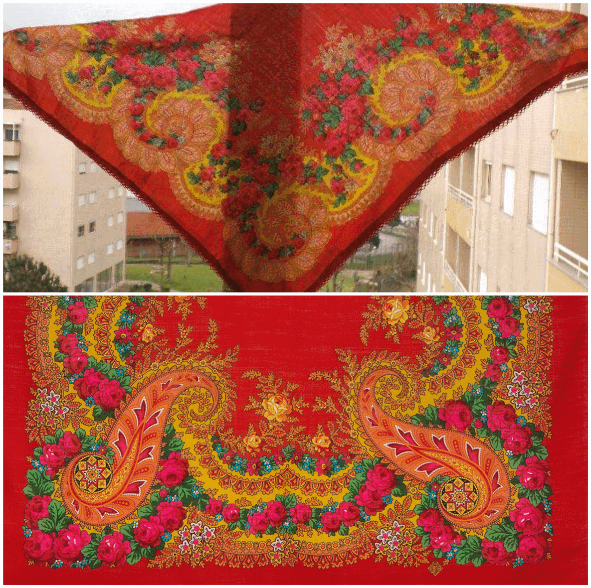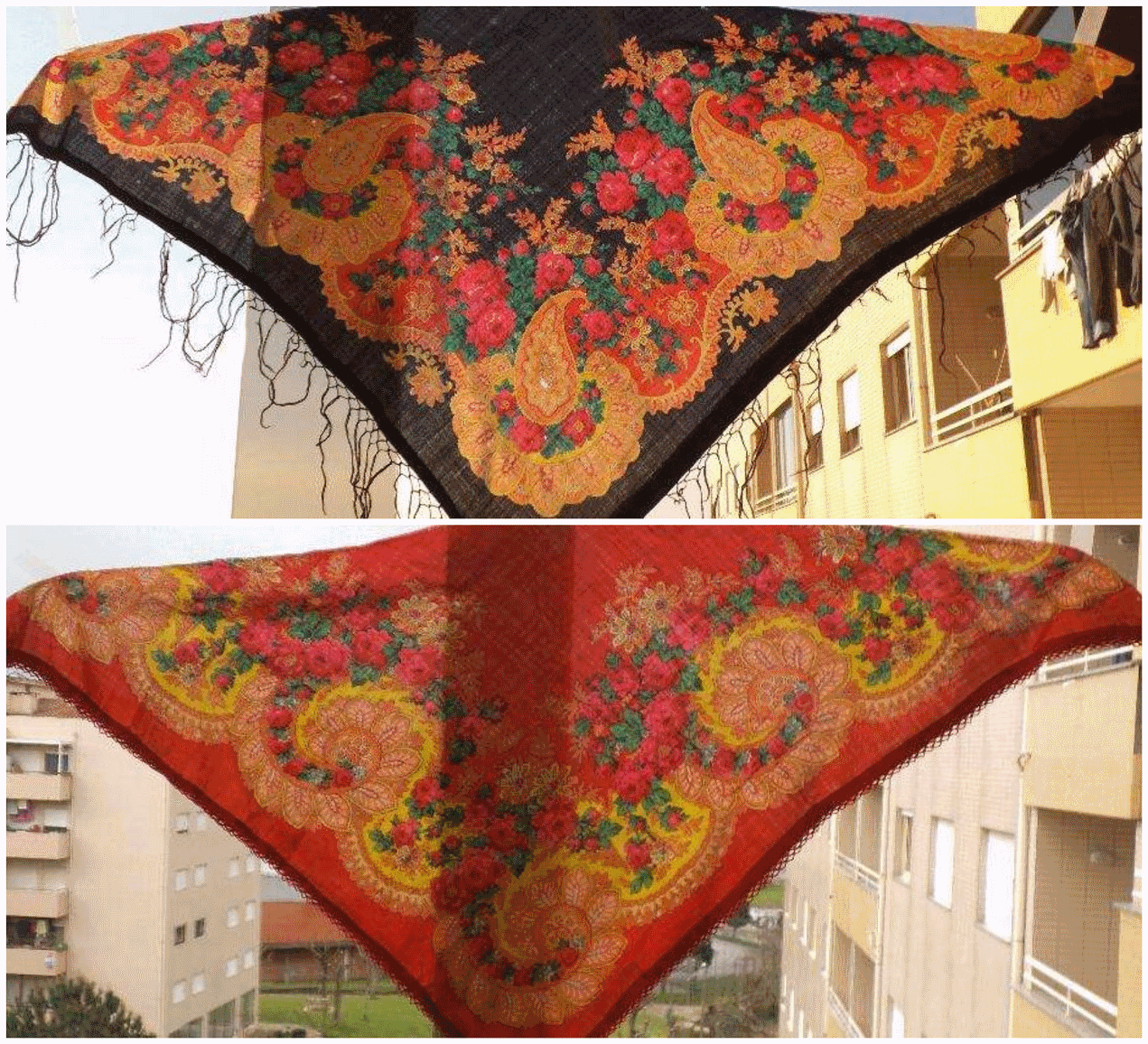 Южный букет же имеет размеры 89х89, и взрослая дама вряд ли сможет носить его подобным образом. Посему возможно, что он предназначен для ношения самым простым, привычным способом, без сложных намоток что на голове, что на плечах. Во многих районах Португалии, в т.ч. в прибрежных рыбацких деревнях платки носят именно так, например, просто накинув на голову и не завязывая концы (сверху надевается шляпа), или так, как носили у нас.