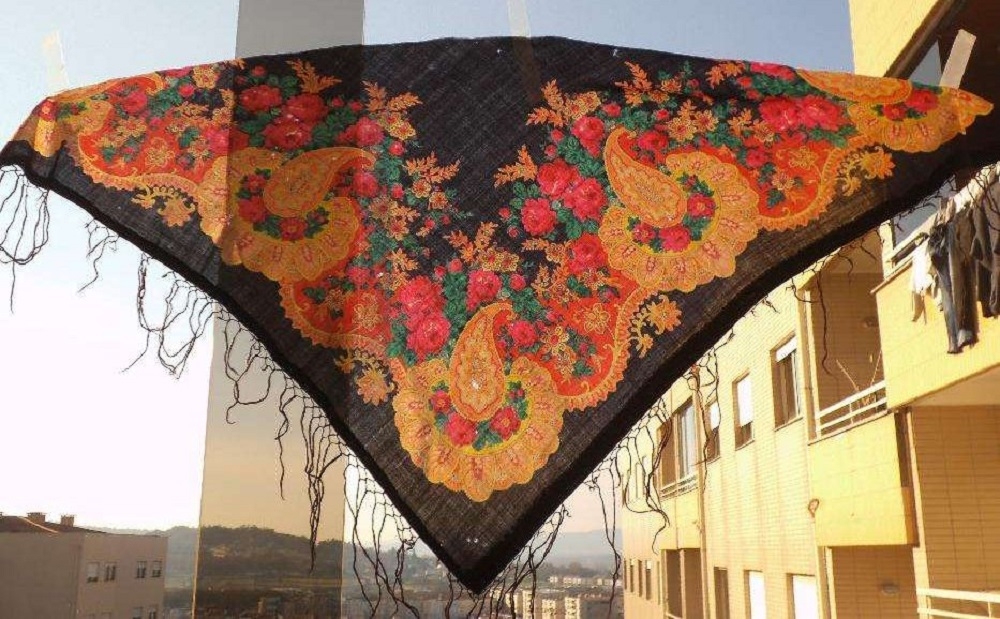 Кроме того, Южный букет1785-5 и шаль с выставки явно имеют разные размеры - шаль значительно больше, кроме того, она с бахромой и, судя по всему, носится традиционным для Португалии и соседней Испании способом - если на плечах - то концы перекрещиваются на груди и завязываются на спине, если на голове - то с обматыванием вокруг головы (как, например, во Вьяна-ду-Каштелу) .
