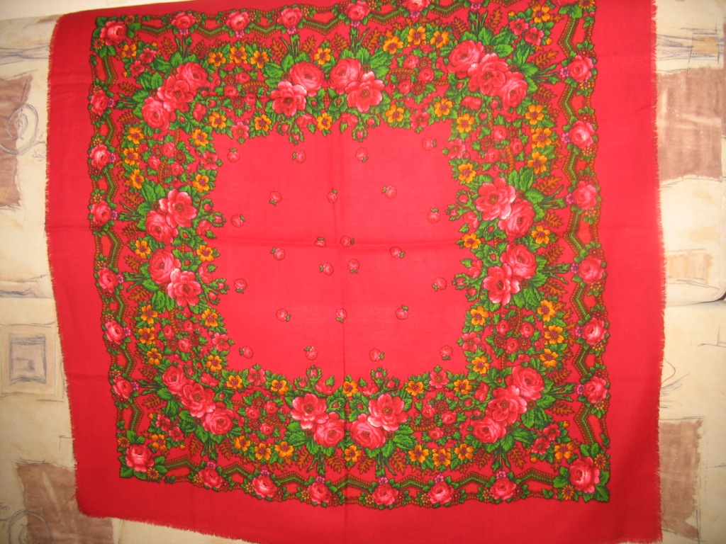 Это платки поменьше, размер 89*89, я думаю. Мне нравится больше красный... Когда были приобретены эти платки не знаю. Подозреваю, что минимум лет 10 назад. Но скорее 20.