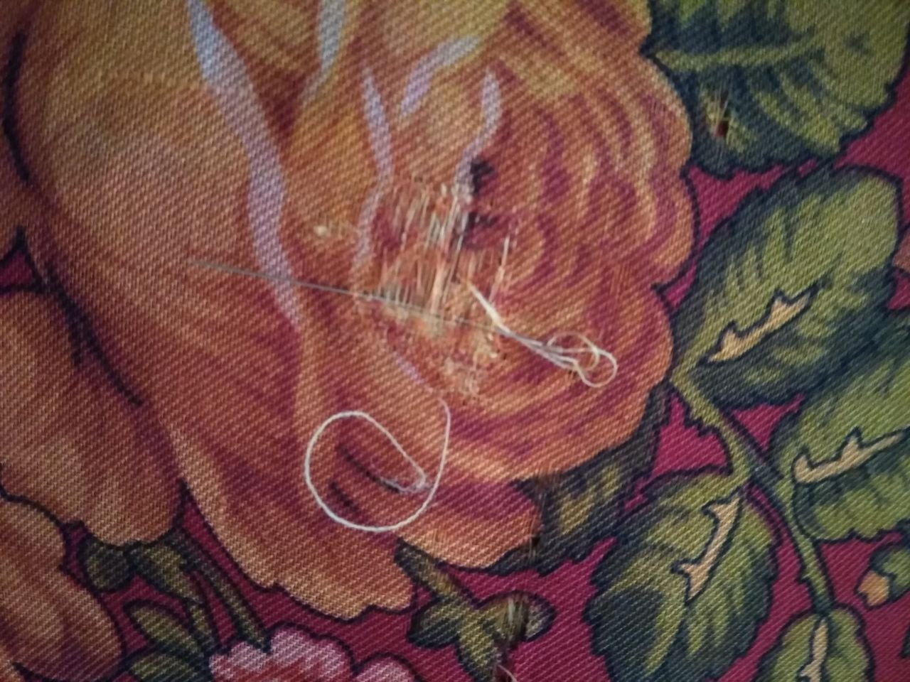 Моё « лечение « дыр не оригинально. Приехал платочек новый и желанный с 2 заштопанными дырочками ( примерно в 1 см). Решила срезать штопку, уменьшить платок. Да, жалко, но как ни крути, штопка всегда оказывается на видном месте и я ее вижу! Наверное моль порезвилась ( хорошо, что в 2 местах), по ткани и бахроме видно, что платок новый и часть этикетки есть.