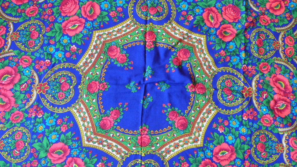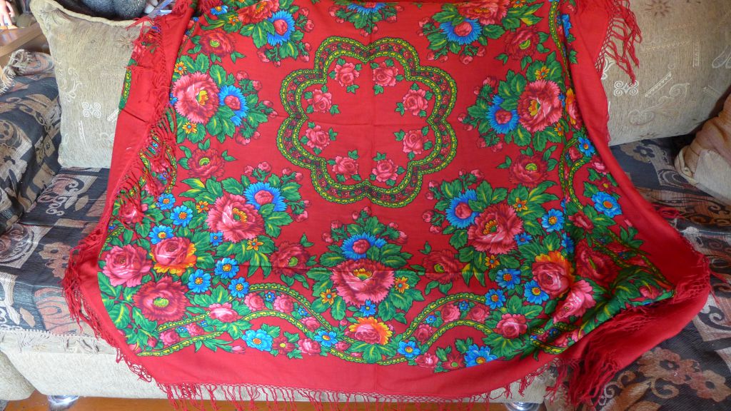 Хочу показать и я свое последнее приобретение. Я платки в последнее время практически не покупаю, но в эту шаль влюбилась с первого взгляда, бегала на нее смотреть и в конце концов купила, не удержалась. Шаль туркменская, есть даже надпись - обожаю вязь, загадочные буквы, теперь у меня и шаль и кольцо есть с восточными надписями вязью. Но художник, мне кажется, павлопосадский и у меня даже есть подозрение на одного, но пока не буду высказывать, подожду, может быть, понимающий народ выскажется. Характер шали - сдержанный, элегантный, немного торжественный и я, бы сказала, концертный. Уже вторая у меня туркменская сдержанная красотка. Набойка ручная, на мой глаз. Прошу любить и жаловать.