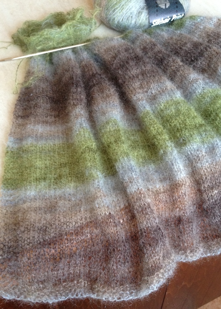 SILKHAIR Print  <br />70 % суперкид мохер ,<br />30 % шелк.  Цвет 322. Не  стоит брать спицы менее 4,  так  как  получается  не  воздушное  полотно  и  резкий  переход оттенков.