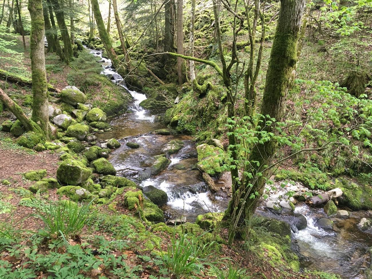 Сначала попробовали спускаться напрямик, но быстро оставили эту затею – слишком круто, повсюду камни, валуны и бурелом, пошли по тропинке, вьющейся по склону траверсами. Шум воды все усиливался, и вот вышли к распадку, куда сбегал каскадом со склона напротив ручей и устремлялся дальше вниз. У воды сразу похолодало. Ручей называется Altenbach (Старый ручей), такие здесь на каждом шагу, питают речку La Thour (приток реки Иль, в свою очередь впадающей в Рейн).