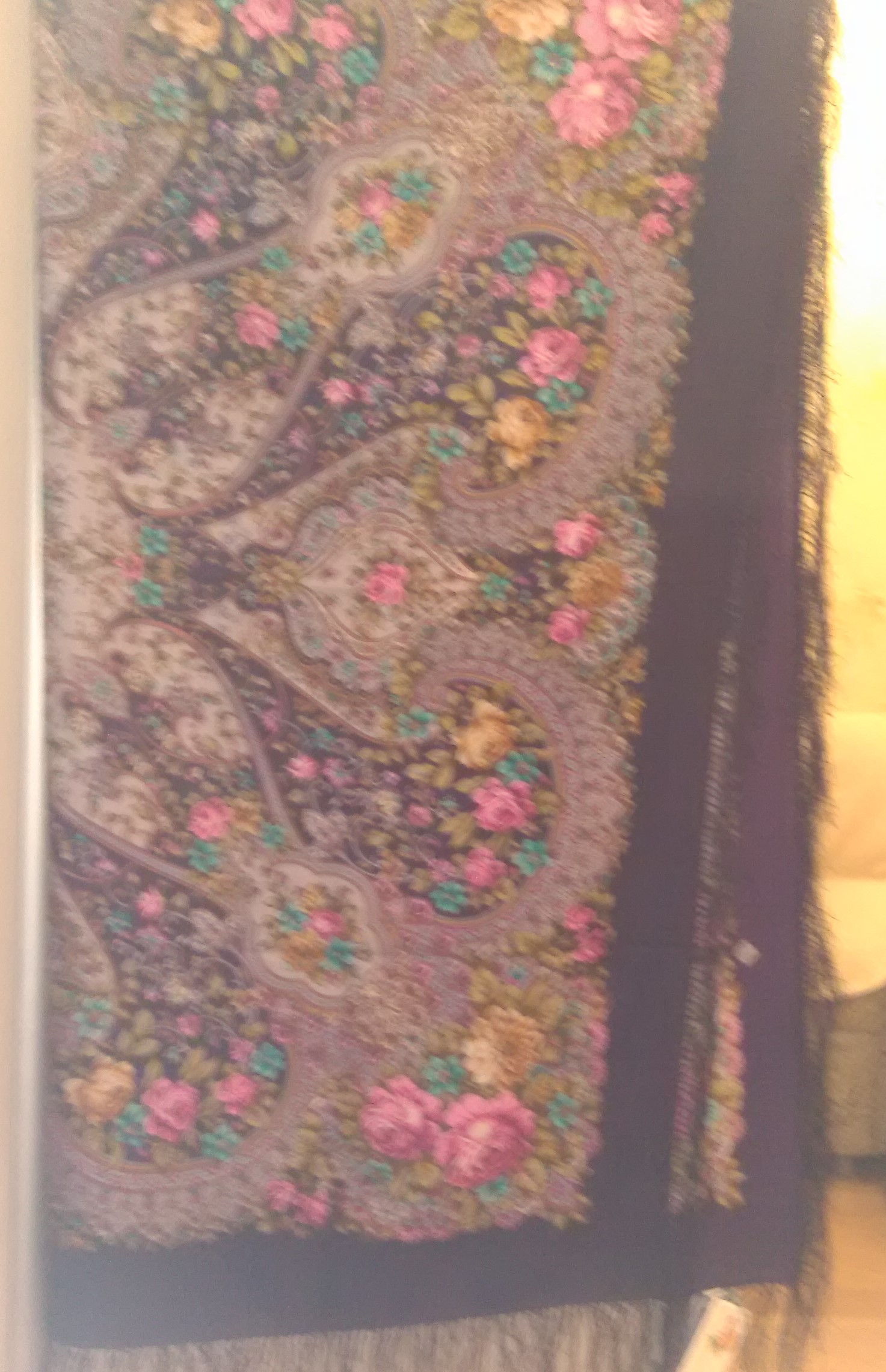 Место такой шали между стандартом и Дисконтом. Почти по всей шали по рисунку идет белая окантовка, видимо, сдвиг рисунка.