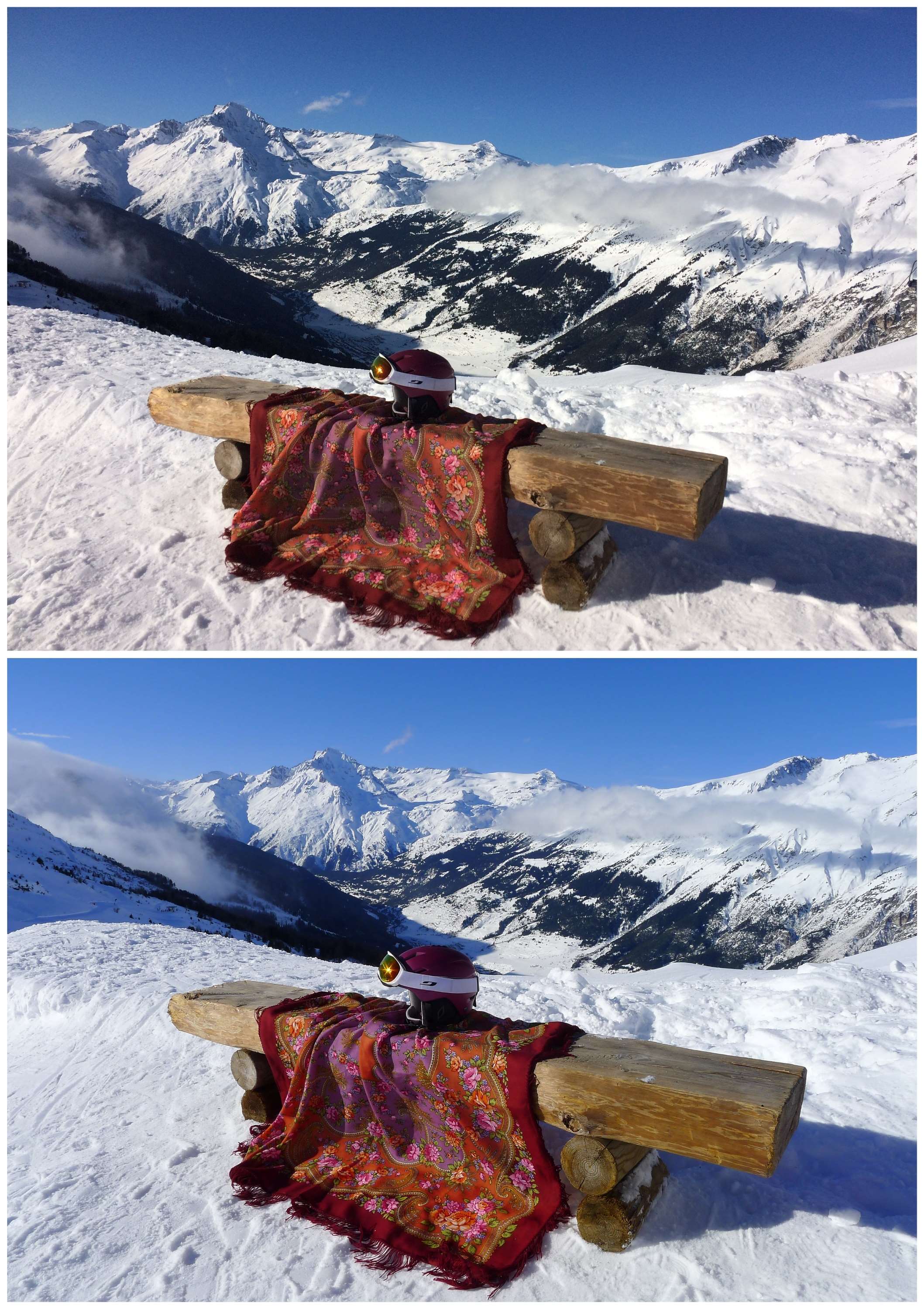 Вот, например, снято в одно время в одном месте, 1 фото на айфон, второе на фотик. А истина где-то посередине. Но платок там, на ярком солнце, смотрелся ярким.