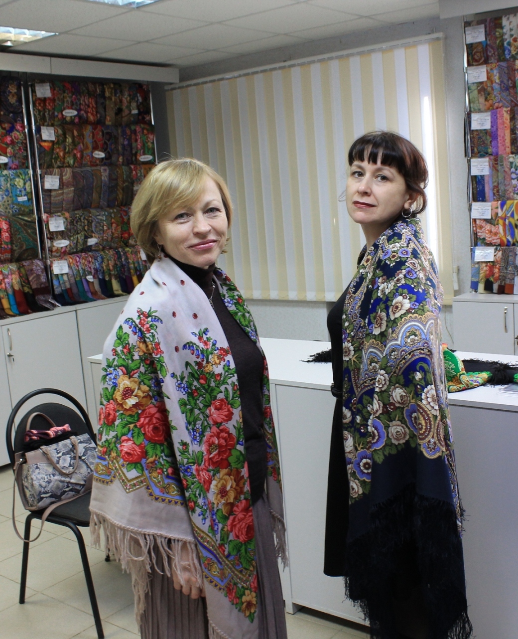Когда на встречу пришла Наташа, я в очередной раз убедилась, что ей безоговорочно идут абсолютно все платки, и все ей подвластны. Совершенно безумный синий Переполох на ней как родной - украшает и совершенно не смотрится лубочным. Прошу убедиться.
