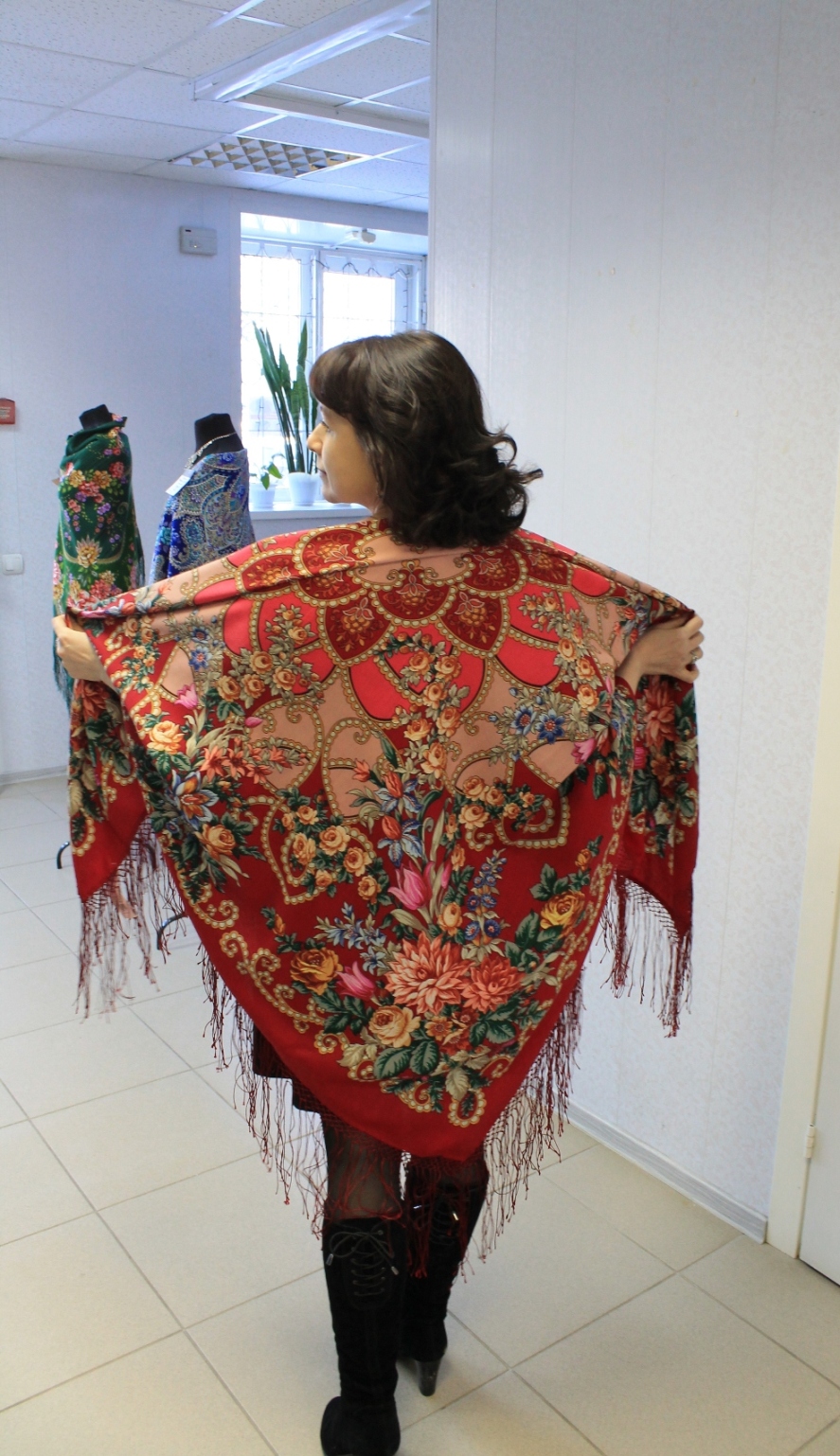 Когда на встречу пришла Наташа, я в очередной раз убедилась, что ей безоговорочно идут абсолютно все платки, и все ей подвластны. Совершенно безумный синий Переполох на ней как родной - украшает и совершенно не смотрится лубочным. Прошу убедиться.